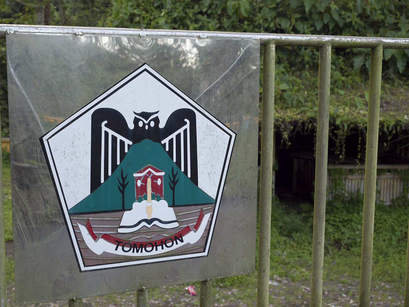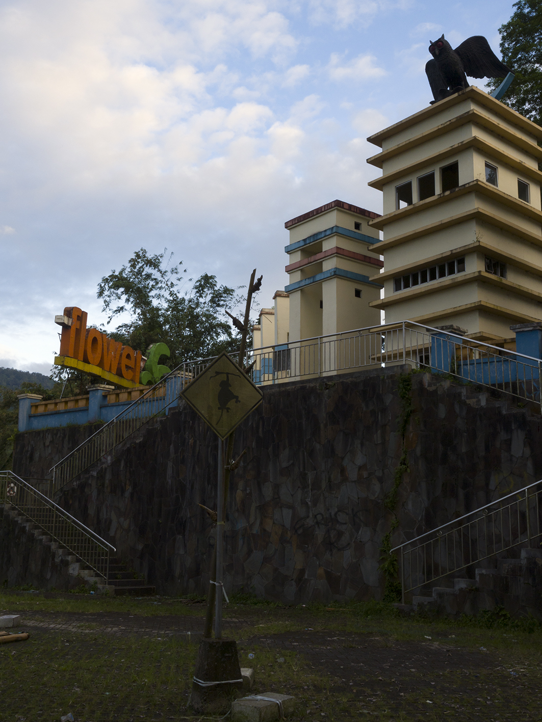 Das größte Rätsel gaben uns aber die pompösen Säulen auf, die den Rastplatz zur Straße hin abschotteten. Was hatte es mit der Eule dort oben auf sich, die mit roten Augen auf uns runterfunkelte? Diesen Turm haben wir vorsichtshalber gar nicht erst betreten, sondern stattdessen nur die Aussicht vom Rande der Plattform genossen, von wo aus immerhin nicht gejagt werden durfte. Was uns das andere Schild in der Mitte des Platzes mitteilen wollte, wissen wir nicht genau, vielleicht „Kletternde Affen“? Gesehen haben wir keinen. Die Eule entpuppte sich letztlich als das Wappentier von Tomohon, wobei sie auch in dieser Darstellung ziemlich bedrohlich wirkte. Für Yoeri hatte der ganze Bau etwas von Ostberlin, wobei der Adler dort erst nach der Wiedervereinigung erneut zum Wappentier aufstieg. Doch megalomanische Denkmäler und skurrilen Partygelände lassen sich offensichtlich genauso in anderen Teilen der Welt finden.