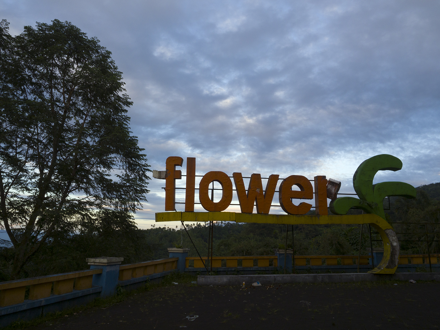 Der chinesische Einfluss wirkte sich im weiteren Verlauf unseres Tages positiv aus. Denn deren „Tambal Ban“ hatte auch am Sonntag geöffnet und so konnten wir einen neuen Schlauch aufziehen lassen und der „Innenstadt“ mit ihrem ominösen Verkehr entkommen. Für den Wasserfall war es inzwischen zu spät, aber unsere Suche nach weiteren Aussichtpunkten, als Insulaner ist es einfach verlockend, den Blick über etwas anderes als den Horizont schweifen zu lassen, führte uns zu der größten Kuriosität des Tages. Aussichtpunkt und Fotopoint – heutzutage vor allem von sich selbst versteht sich – in Kombination mit einem verlassenen Rastplatz, umgeben von Ständen, die aussehen, als ob der Dschungel sie bald vollkommen verschlingen würde. Eine passende Kulisse für Zombiefilme oder aber Party mit Blick auf Manado und dazu den bezaubernden Schriftzug „Flower“ aus Pappmaschee, mit dem sich die Gegend passend selbst beschreibt.