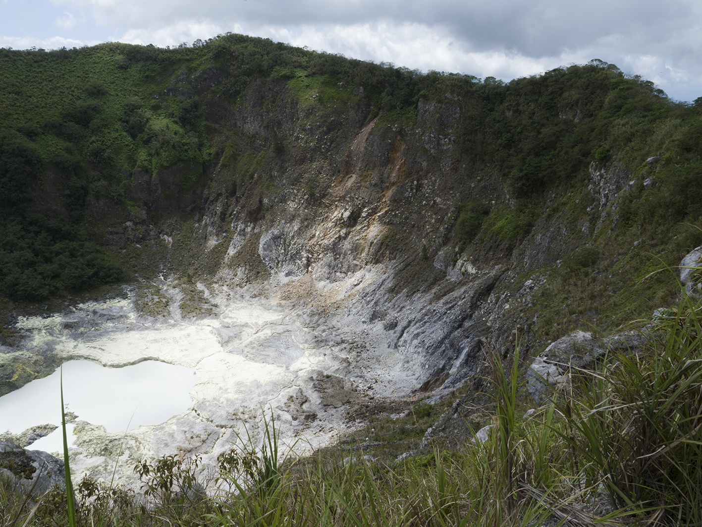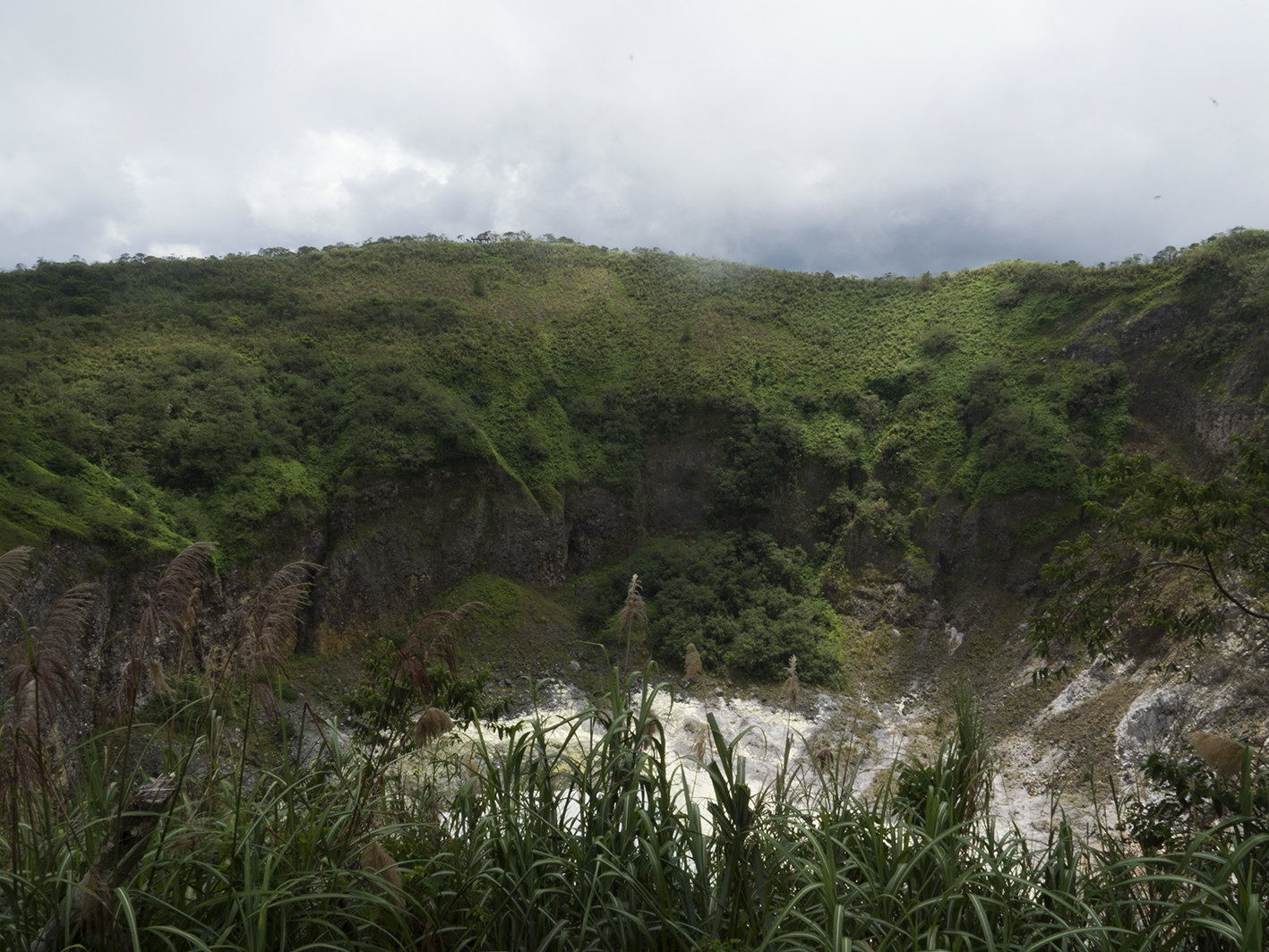 Yoeri fand es sehr gelungen, dass die Wolken den Blick auf die ausufernde Stadt verdeckten und die Minahasa Highlands so erst richtig zur Geltung brachten. Die schottischen Highlands kennt er schließlich genauso wolkenverhangen. Was soll man machen, es herrscht eben momentan in weiten Teilen des Landes Regenzeit. Immerhin wurden wir nicht nass und konnten wenigstens in den Krater mit seinen gelben Schwefelablagerungen und kleinen Rauchsäulen hineinschauen. Vermutlich waren wir an diesem Tag die einzigen, die den Vulkan umrundet haben – und das noch mit erschwerten Auf- und Abstieg. Unser erster Gipfelsturm nach über drei Jahren im Land! Kaum wieder beim Motorrad angekommen, lichteten sich die Wolken für mich.