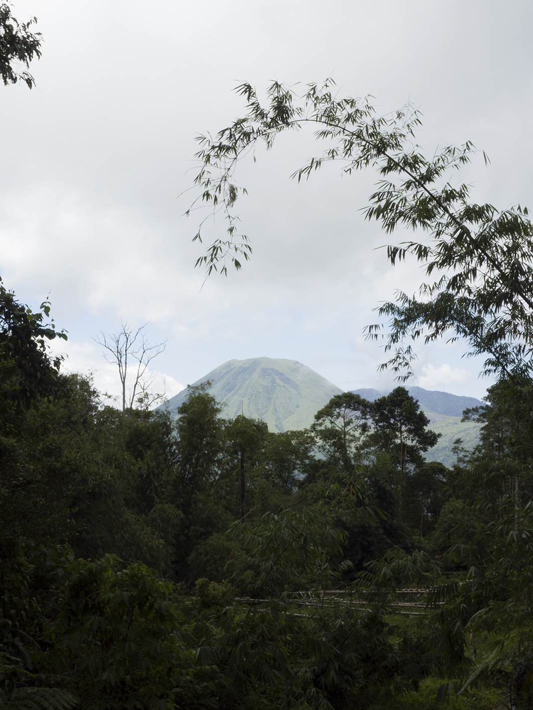 Bei unserer ersten Rundfahrt mit dem Motorrad durch den Ort hatte ich bereits ein Schild entdeckt, das den Weg zum 1.324 Meter hohen Berg wies. Das reichte mir vollkommen, um Yoeri vom Rücksitz des Motorrads aus zielsicher zum Parkplatz lotsen zu können. Von hier aus sollte es in nur zehn Minuten über eine Treppe an den Kraterrand des Mahawu gehen – fast schon zu einfach. Statt einer Treppe folgten wir dann jedoch einem streckenweise äußerst rutschigen Pfad, der erst nach zehn Minuten wirklich zu steigen begann. Wir sind schon echt unfit, wenn andere Leute es in nur zehn Minuten bis nach oben schaffen, dachte ich mir im Stillen. Yoeri kam ins Schwitzen und warf ein, er komme aus dem Flachland, heißt schließlich nicht umsonst Niederlande, und Berge besteigen, entspräche nicht seiner Natur.